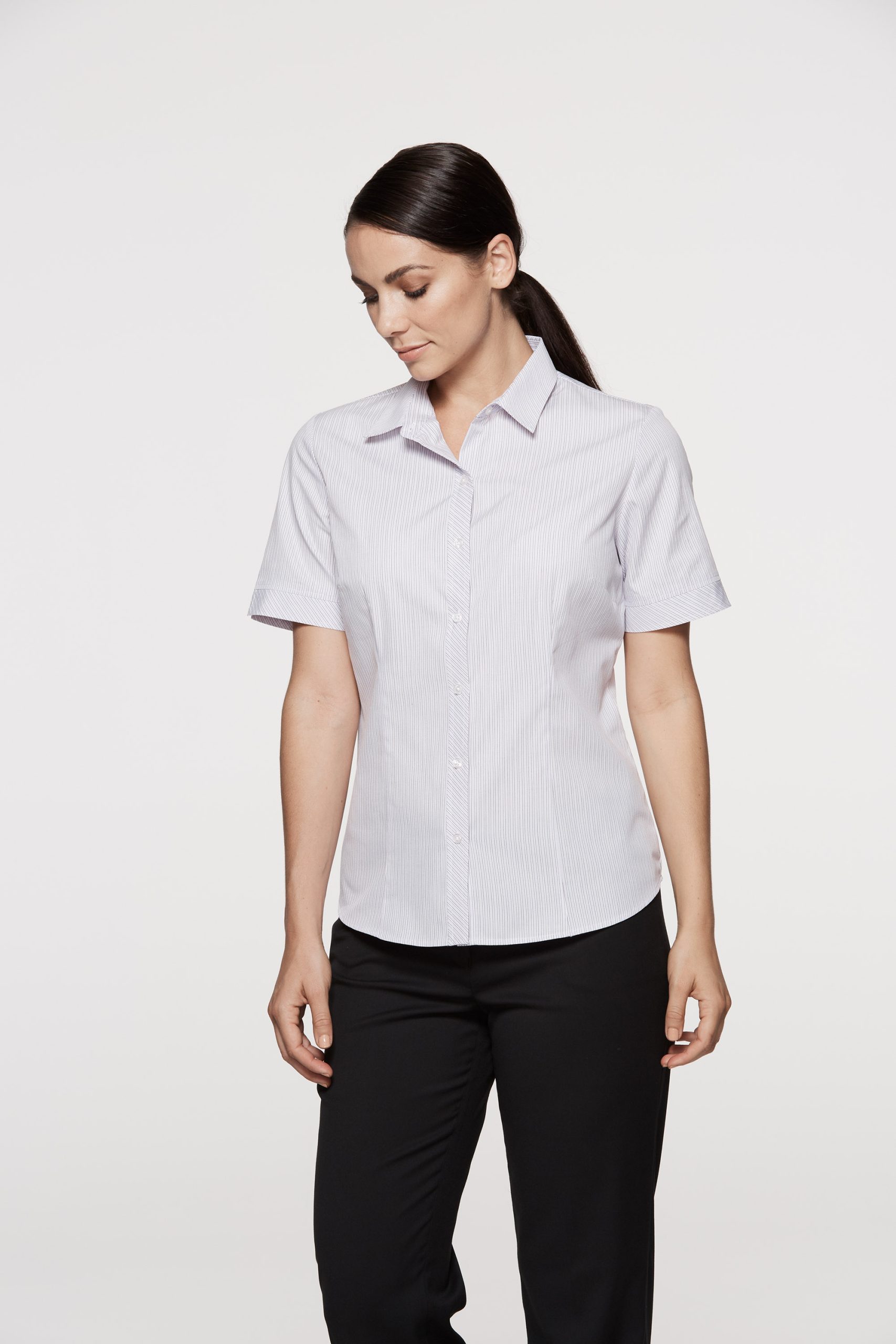 Bust darts, slimming front and back waist darts, a ‘Magic Button’ to prevent gaping and bias cut cuff sleeves