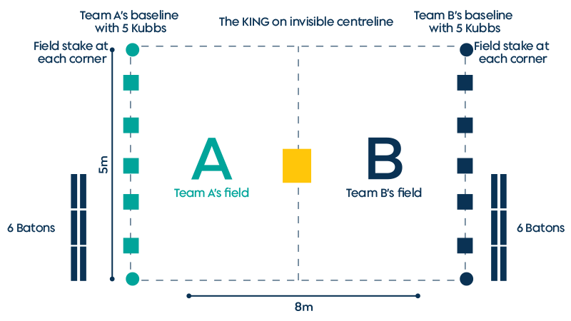 Be the first team to knock over all the other team’s kubbs, followed by the King. The starting team is decided by each team tossing a baton towards the King. The closest baton to the King without touching it goes first (if you touch the King the other team starts).